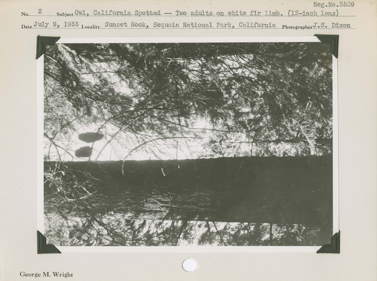 Owl, California Spotted -- Two adults on white fir limb (12-inch lens). Locality: Sunset Rock, Sequoia National Park, California. Negative #: 3509