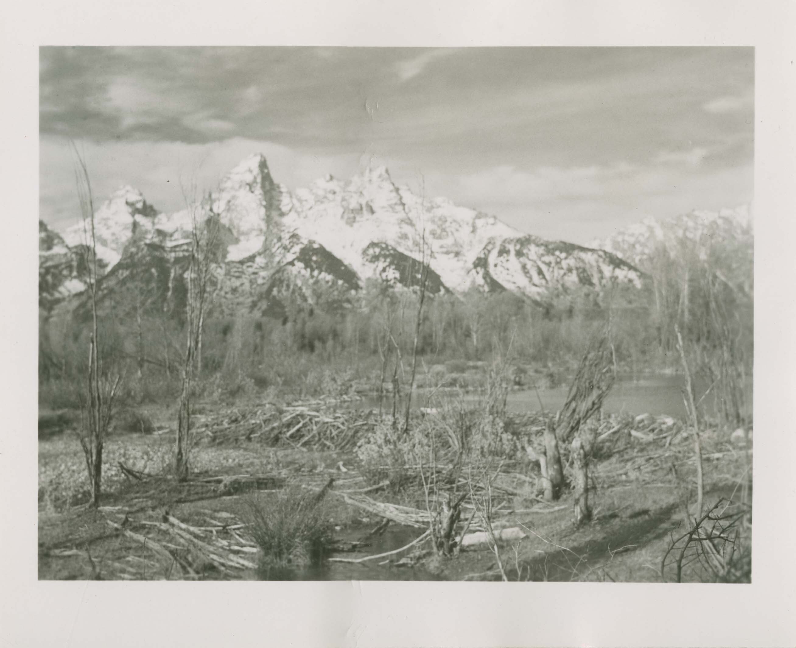 Beaver dam and pond. East side of Snake River above old Farrell homestead, about 5 miles North of Moose Post Office. Locality: Jackson Hole National Monument [Grand Teton National Park]. Negative #: 11250. Location of Negative: Biologist’s Office, Director’s Office. [The date and location come from the reverse of the envelope for this negative number.].