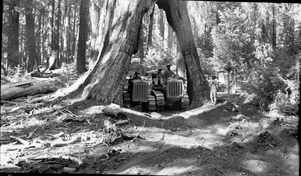 Miscellaneous Named Giant Sequoias, two tractors under Wishbone Tree.