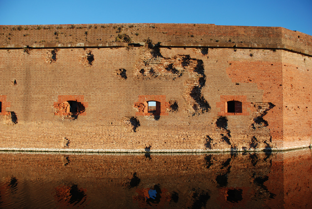 An image of the south wall of Fort Pulaski showing rifled artillery damage. The precision of the rifled cannon can be seen in the damge the goes up and over the second opening from the right. There is in fact a projectile imbedded in the wall at the left corner of the "seven" shaped damage.