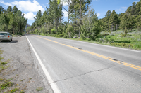 A trail goes off the road through a sagebrush covering opening with trees in background.