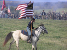 Union cavalryman riding along the battlefield with a US Cavalry guidon.