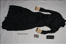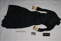 Navy figured silk dress with long sleeves ending in white lace that is also around the neck and collar