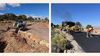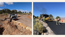Two photos: Left, a small bulldozer moves dirt on a construction site under a blue sky. Right, workers in safety vests and helmets pave a road with fresh asphalt as a large paving machine emits smoke.