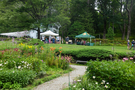Photo taken from formal garden with canopy pop up tents in the background and visitors walking around
