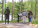 Three people read a wayside exhibit at a curve in a path. They face away from the camera, toward a tree-lined lake. To their left is a bronze statue of a women appearing to walk toward the lake. The women wears a fringed dress and boots, and is carrying a young child in a cradleboard on her back.