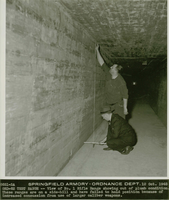 Black and white photo of two men in a narrow hallway. One man holds the top of a string to the ceiling. The other man is on the ground with the stick that is attached to the end of the string. Text under the photo reads, “6651-SA Springfield Armory – Ordnance Dept. 12 Oct. 1948, ORD-62 TEST RANGE -- View of No 1 Rifle Range showing out of plumb condition. These ranges are on a side-hill and have failed to hold position because of increased concussion from use of larger caliber weapons.”