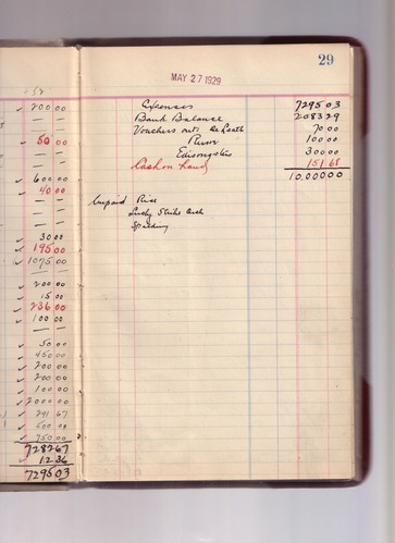 Some of the markings made in pencil in these cash books were made by ENHS Curator Leah Burt during the 1970s and/or early 1980s. For Leah Burt handwriting examples see pages for: December 19, 1921 (cash book 17) ; February 12, 1923 (cash book 17) ; October 27, 1924 (cash book 18) ; December 01, 1925 (cash book 19). Notebook EDIS 1432 was previously numbered in error as cash book #21. It is not a cash book, and is not included here.