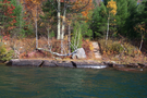 Low, flat rocks at the edge of the island with a path into the fall colored trees, green water in the foreground.
