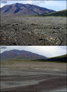 A photo pair showing Increasing Vegetation on River Bars at Toklat River: 1958-2001