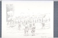 Scene depicts the start of the Battle of Shiloh on April 6, 1862 in Fraley Field when Maj. James E. Powell's Union reconnaissance patrol encountered Maj. Aaron B. Hardcastle's Confederate pickets of the 3rd Mississippi Infantry Battalion.