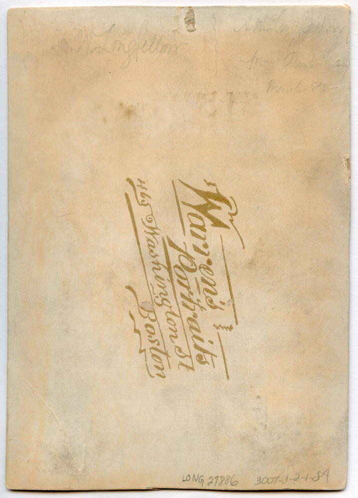 Back of a cabinet card. Front shows an image in an oval. Henry Wadsworth Longfellow almost full profile to left (his right). Striped texture of suit visible. Inscription: "H.W. Longfellow / A W Longfellow [Jr.] / from Aunt Mary [Greenleaf] / March 82" written lightly in pencil in cursive probably by AWL Jr. Photographer stamp includes "Warren's / Portraits / 465 Washington St. / Boston." in gold ink verso. "Warren" stamp in gold ink also below image. Notes: 1878. Appearance, outfit, and photographer dates at this address compatible with 1878 date given in inscription. Presumably MLG gave this photograph to her nephew AWL Jr. after Henry Wadsworth Longfellow death in 1882. Associated Materials: 3007-1-2-1-83 identical image.