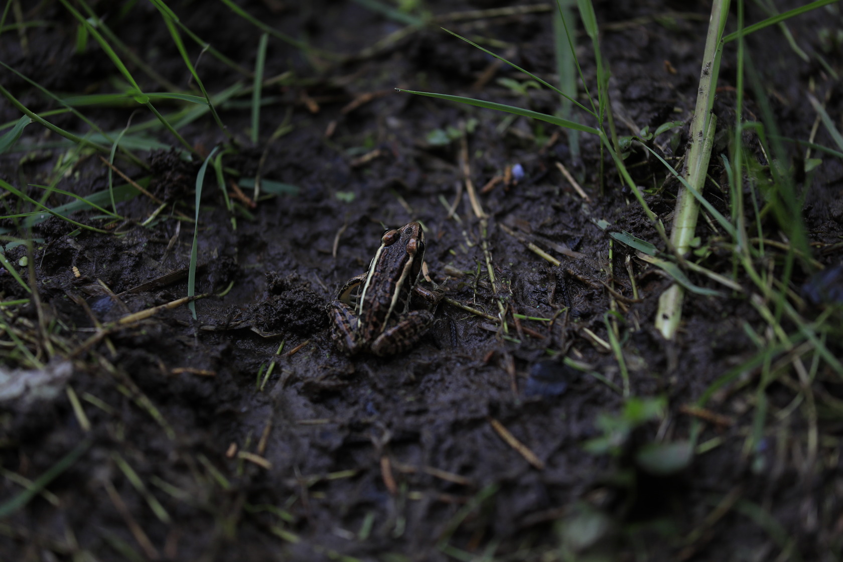 A pickerel frog in the mud surrounded by sparse grass.