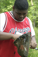 Students are participating in a unit called Roles and Residences. They are exploring the roles of different species and the diversity of habitats in a watershed. Here they are studying a pond ecosystem, catching small animals in nets and observing them in containers. Students record data in their Discovery Books. || The Cuyahoga Valley Environmental Education Center's residential program provides fourth through eighth grade classes an overnight educational experience that integrates science, nature study, environmental issues, and the arts. Students learn natural history and the concepts of watershed, biodiversity, and habitat. In addition, environmental issues and the process of environmental decision-making are explored. The curriculum is designed to meet state standards and teach proficiency skills, especially in science and social studies.