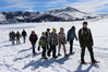 A park ranger leads a large group of students on a snowshoe hike in a mountainous landscape.