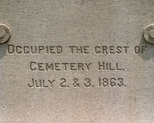 1 of 4 Monuments to Illinois. Marks 1st line of battle held by 82nd Illinois before retreating to East Cemetery Hill. Located on W Howard Ave near Wheeler's Battery. || 1 Mn. Smooth base 5' sq. Smooth shaft with excised inscription & detailing, bronze medallion in lower part of shaft. Topped w/curved, cylindrical cap. All 12'6" H. Small chips in base.