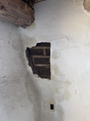 Amended adobe bricks are exposed through a section of white stucco that has fallen due to moisture exposure.