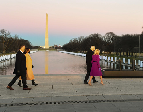 On January 19, 2021, President-Elect Joseph R. Biden and Vice President-Elect Kamala D. Harris led a memorial service to remember and honor the lives lost to COVID-19 as part of the 59th Presidential Inauguration events. The ceremony took place at the Lincoln Memorial Reflecting Pool, which was lined with pillars of light.
