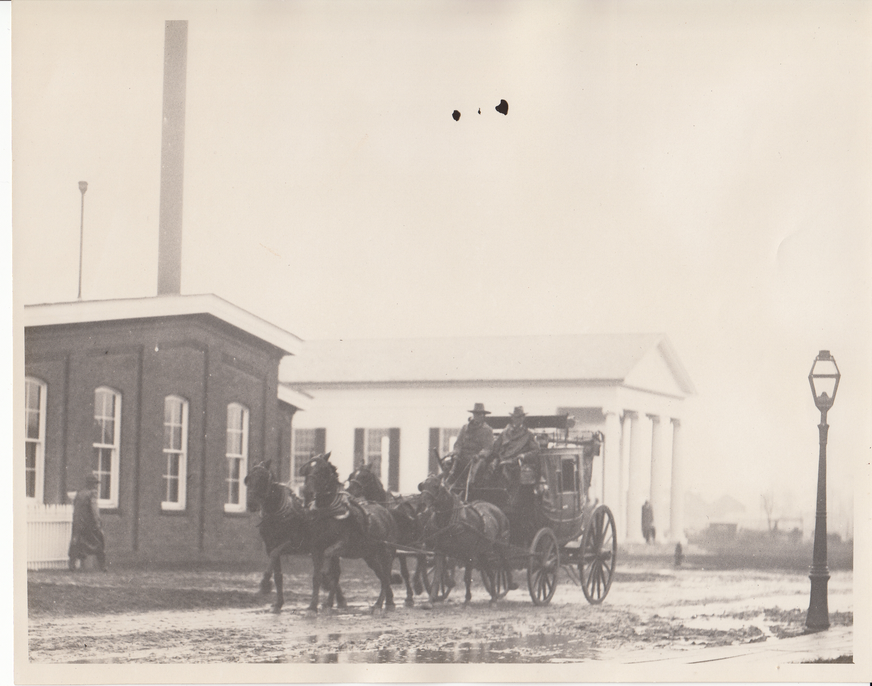Stage coach at reconstructed Menlo Park site. Menlo Park Machine Shop at left.