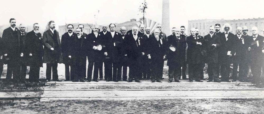Frederick Douglass (right) standing with a group of men at Eastman Kodak. President Benjamin Harrison stands near the middle of the group. Taken on Memorial Day 1892.