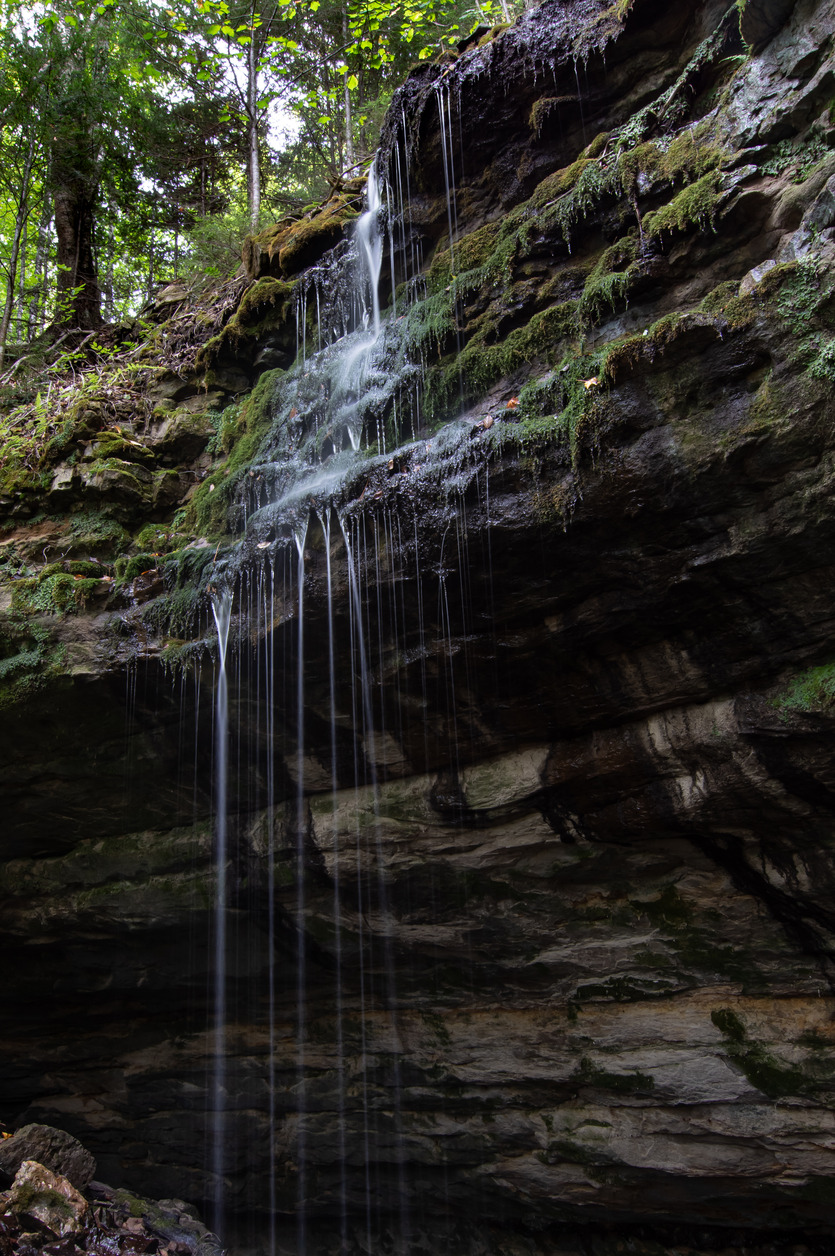 Water flows in narrow streams over a sandstone rock ridge covered in moss and other vegetation.