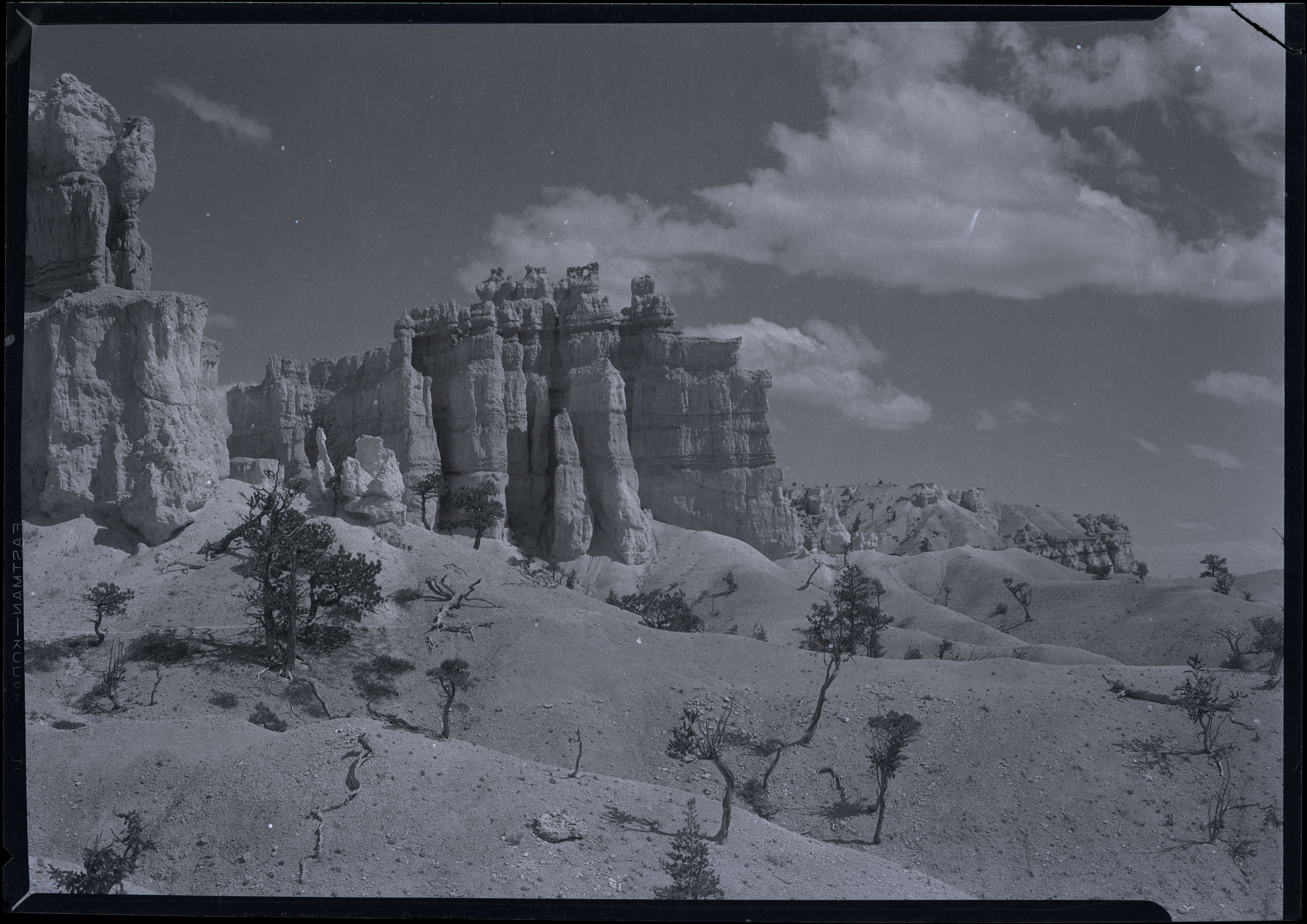 Nitrate negative of hoodoos with window toward top in BRCA. Sparse vegetation in foreground. ; BRCA Museum and Archives Image BRCA8875_001_225 ; BRCA 8875