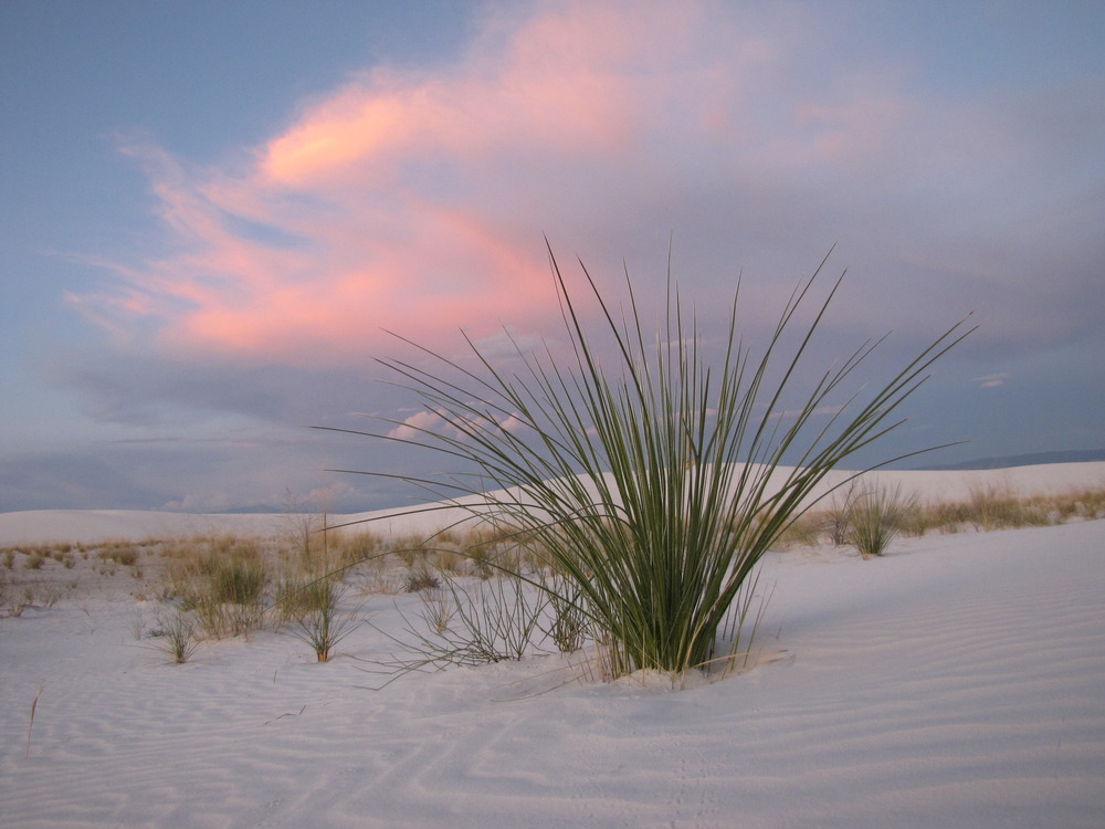Vegetation dots the surface of an interdunal area under pink clouds in the evening sky.