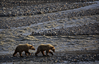 A sow and her two yearling cubs use their front claws and mouths to tear meat from a caribou carcass while eating dinner on the Toklat River on Tuesday, July 18, 2017.