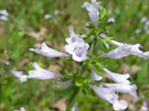 Several light blue, trumpet like flowers on a square stem.