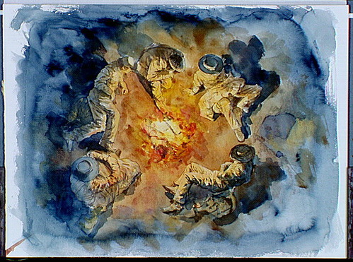 View from overhead of Confederate soldiers sitting beside campfire.