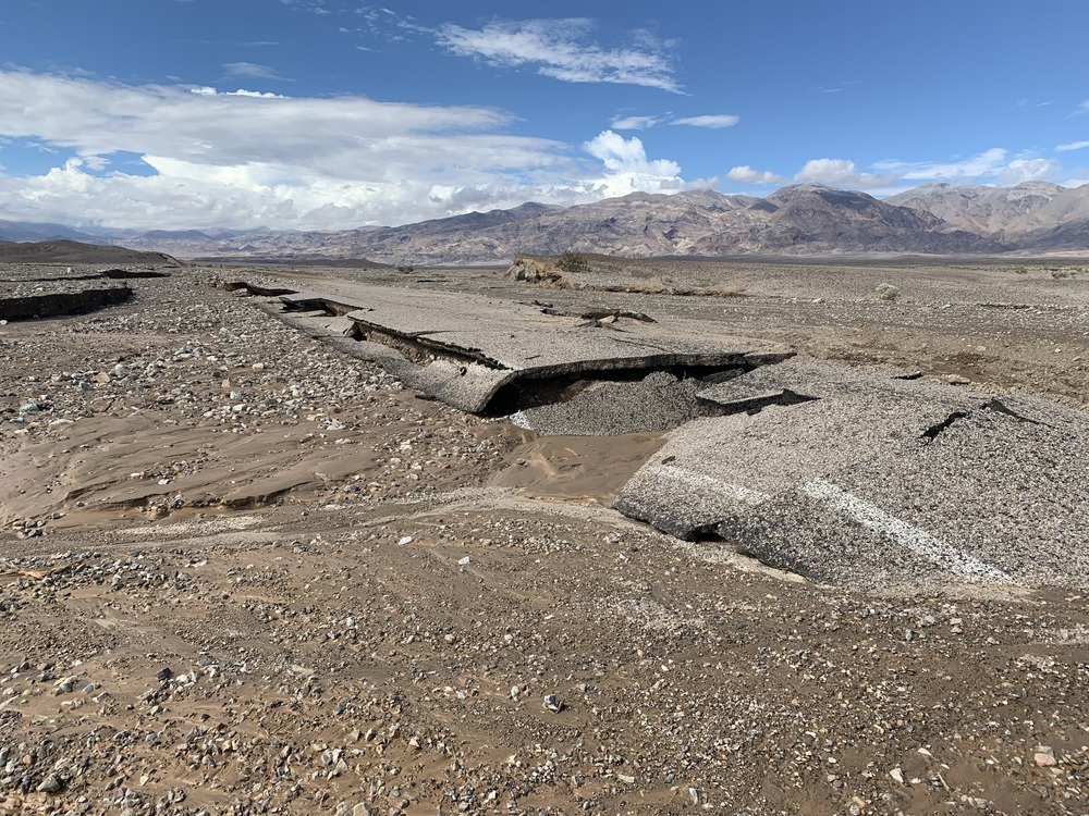 Mud and rocks left behind from flash flood in the foreground, asphalt broken in places behind it in front of a mountain landscape.