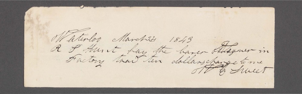 On front of document: "Waterloo March 24 1843 R P Hunt pay the barer Wagner in Factory trad ten dollars charge to me W E Sweet" On back of document: "W E Sweet order $10"