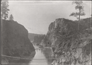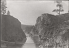 Black and white photograph of a narrow gorge with a thin bridge over a river