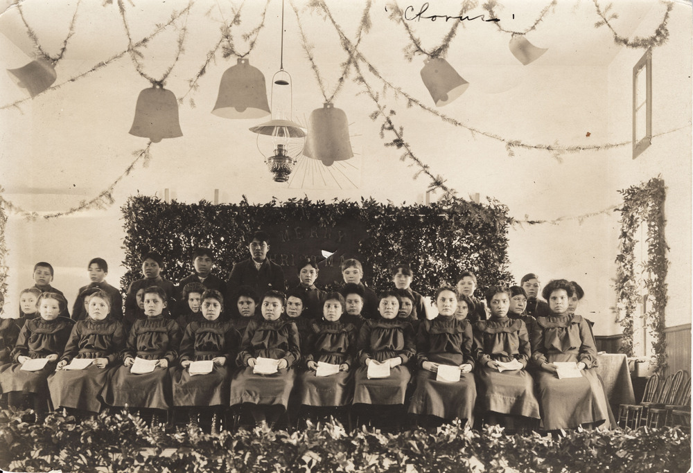 Fort Spokane, Boarding School Student "Chorus" Front Left Sitting: O'Hara (?); Lena Brown; (?); Daisy Moses; Susie Agusta; Annie Sockemtickem; Agnus Hill; (?); Mary or Maggie Sherwood; Gloria Pichette. Middle Row: Esther Wynecoop (?) Back Row: Big Boy In Middle, George Flett; 7th From Left Jim Cox. Students are on stage at Christmas.