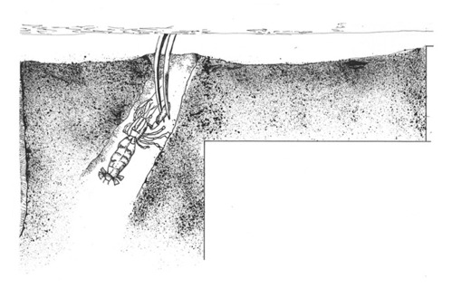 Detail of sub-surface view of Bilinas Lagoon: Ghost shrimp with beak of Long-billed curlew visible.