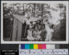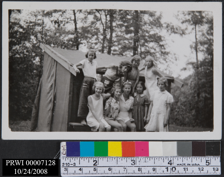PEOPLE GIRLS ACTIVITIES BUILDING A GINGERBREAD HOUSE<CRWRITTEN ON PAGE "WE BUILT THIS"<CR9 GIRLS POSE FOR PICTURE AT HOUSE ONE HAS HAND ON KNEE<CR<CR<CRCATALOG # ON ARCHIVAL LINEN TAP LAID ON PAGE GLOVES IN HANDLING