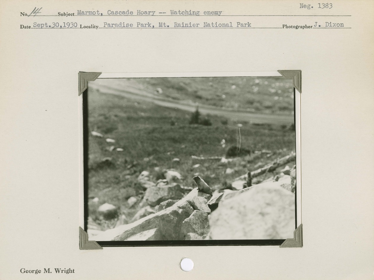 Marmot, Cascade Hoary – Watching enemy. Negative #: 1383. Locality: Paradise Park, Mount Rainier National Park.