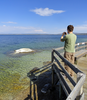 Man standing on boardwalk pointing camera at geyser cone sticking out of water in large lake