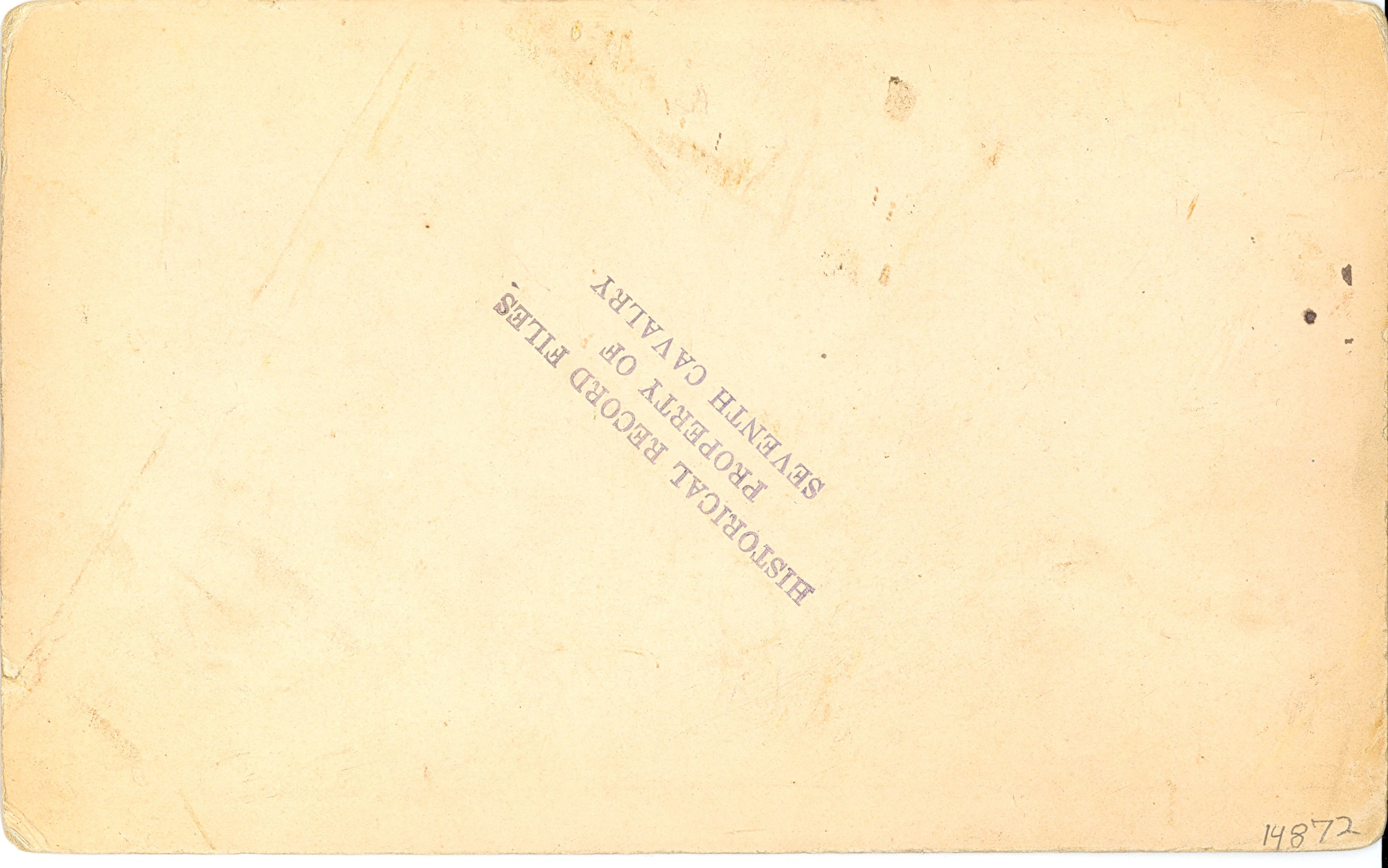LIBI_00011_14872; An albumen photograph, mounted on card, depicting Forge and limber style wagon from G Troop, 8th Cavalry, including a sergeant standing beside the wagon and a private seated in the driver’s seat. Handwritten ink description in on the bottom of card mount reads “Forge and Limber, “G” Troop, 8th Cavalry.” Created by an unknown photographer on an unknown date. Image is fading and yellowing.; PRINT, PHOTOGRAPHIC [Mounted on card]; Courtesy of the National Park Service, Little Bighorn Battlefield National Monument, LIBI_00011_14872, Unknown Photographer, "Forge and Limber Style Wagon with a Private and Sergeant from Troop G of the 8th Cavalry," date unknown