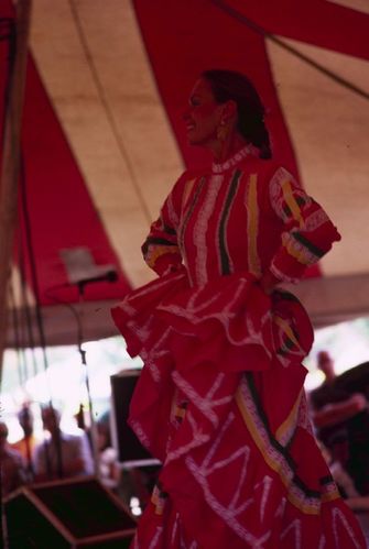Woman in a pink dress. ; August 1982