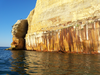 Pictured Rocks Cliffs are streaked with reds and oranges and black colors. These are caused by minerals seeping through the sandstone rock.