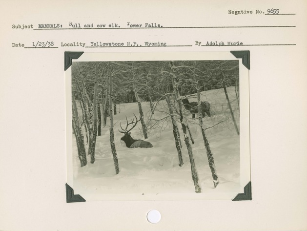 Bull and cow elk. Tower Falls. Negative #: 9655. Locality: Yellowstone National Park, Wyoming. Location of Negative: Region Four Headquarters. [Some of this information comes from the reverse of the envelope for this negative number].