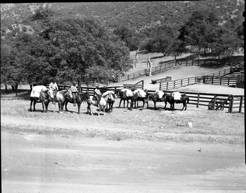 Bill Jones, 720500, Ash Mountain, SNP, NPS Groups, Training Mule Pack String, Corrals. Roy Lee Davis, Jr. pictured, stock use.