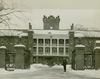 [Exterior view of Administration Building (1819) after a snowstorm. Main entrance gate is open. Two side gates adjacent to the Main Gate are closed. A security officer wearing overshoes and gloves stands before the ope gate.]