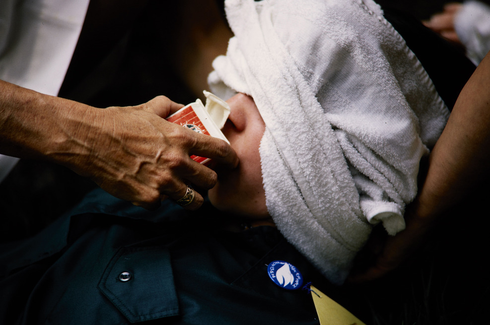 Demonstrations. Woman suffers from heat exhaustion due to the 90° weather during and anti-war demonstration in Washington DC.