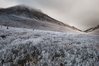 frost covering plants on a hillside, leading up to a cloud-capped mountain