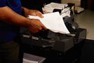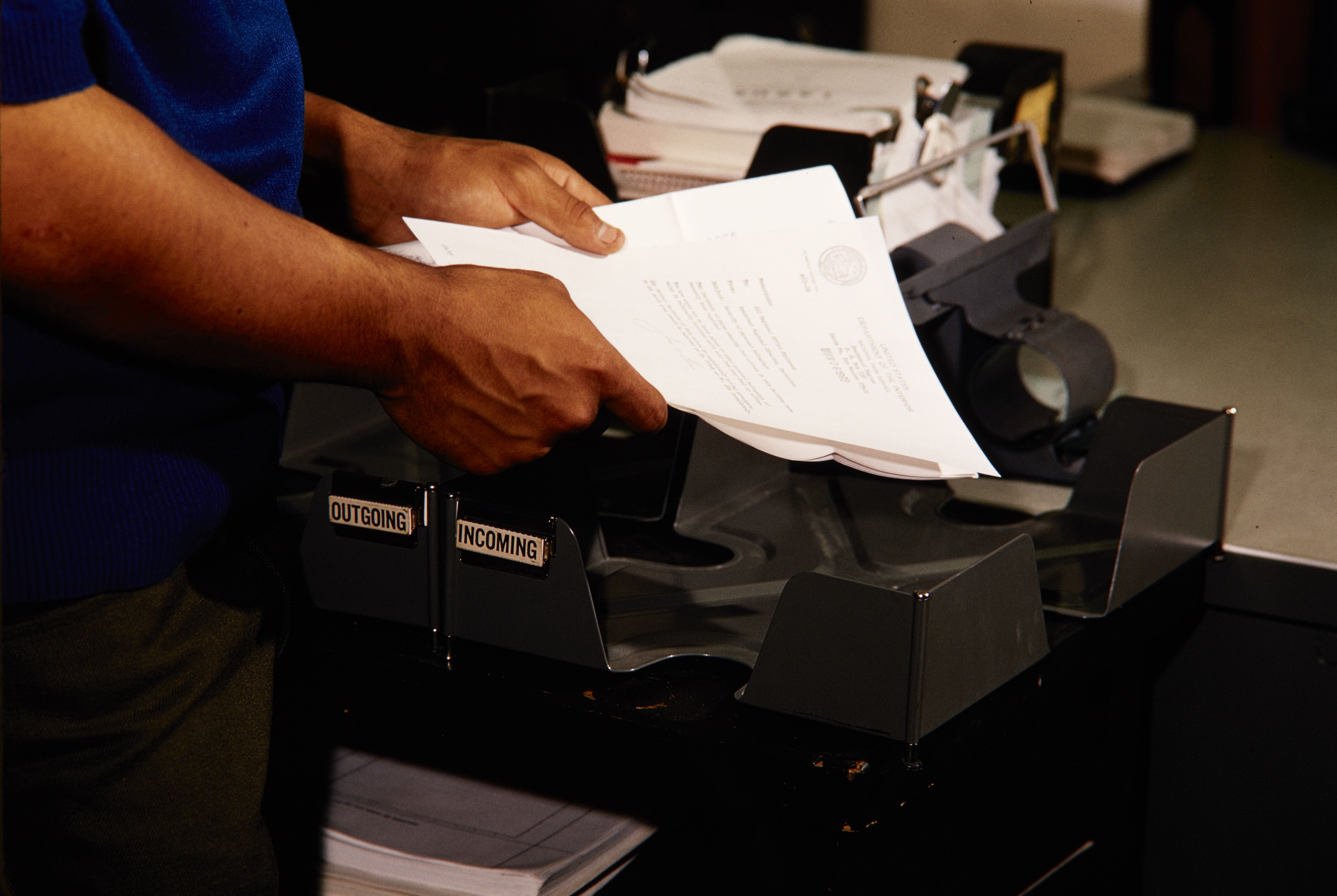 Native American mail run in the southwest regional office delivering to one of the incoming boxes. Image Number 69-436-2.
