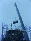 Against a foggy sky a crane hoists a rectangular container approximately 6 feet by 3 feet and 2 feet deep from a monument shrouded in extensive scaffolding