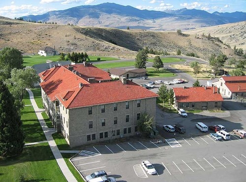 Aerial photo showing the double cavalry barracks, the blacksmith shop, and one end of a horse stable