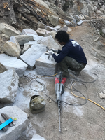 A man squats above a large rock with metal protuding metal roads. A long drill lays on the ground next to him.